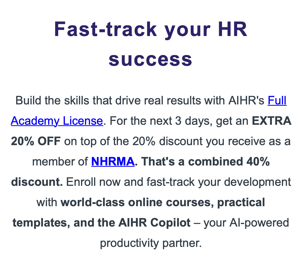 How NHRMA Gets You ThereExperts at AIHR have analyzed insights from 13,000+ HR professionals and identified the four skills that set future-fit HR teams apart. NHRMA has access to the best of AIHR, including their studies and training materials, and well-respected job aids, to upskill in these four areas: